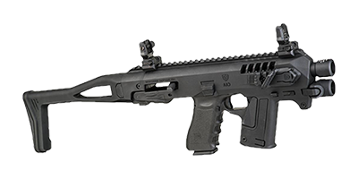 The CAA RONI is a conversion kit that turns a Glock pistol into a compact submachine gun-style carbine, providing improved stability and accuracy.